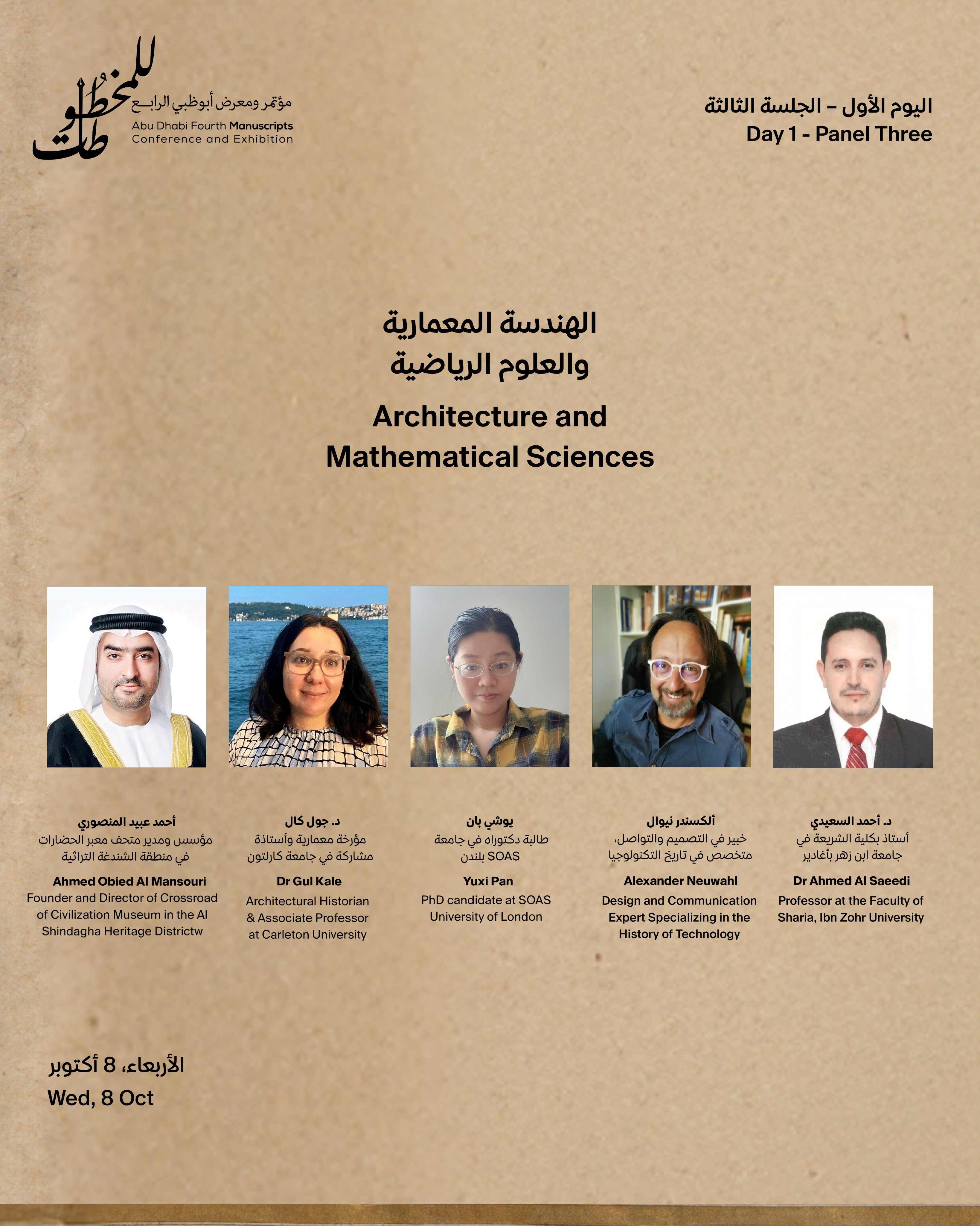 مؤتمر أبوظبي الدولي الرابع للمخطوطات الذي يُنظّم بالتعاون مع جامعة ماكغيل الكندية في العاصمة أبوظبي بدولة الإمارات العربية المتحدة بعنوان: "جماليات الفنون البصرية في المخطوطات العربية والإسلامية"، تحت شعار "الإرث الفني وتأثيراته المعاصرة"، وذلك خلال الفترة من 8 إلى 9 أكتوبر 2025.